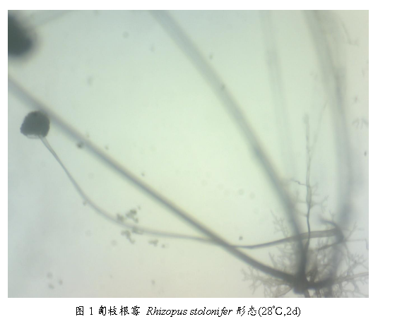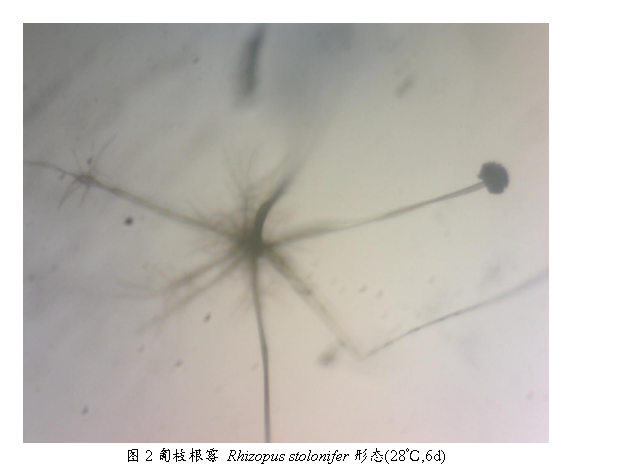 形態觀察特點: PDA培養基上接種,28℃培養。第2天即可看到匍枝根霉產孢,且產孢較多,易觀察。其菌絲無隔膜、有分枝和假根,營養菌絲體上產生匍匐枝,匍匐枝的節間形成特有的假根,從假根處向上叢生直立、不分枝的孢囊梗,頂端膨大形成圓形的孢子囊,囊內產生孢囊孢子。培養一周左右可看到明顯的孢子脫落。連續觀察2周,仍然可以看到明顯的產孢結構,菌絲、孢子囊、假根形態觀察明顯。