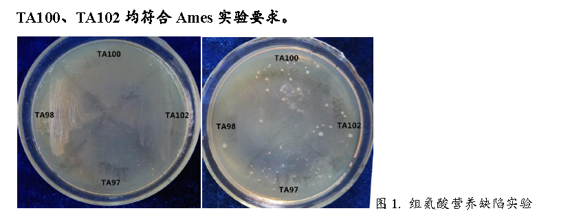 3.1 吸取TA97TA98TA100TA102菌懸液0.1ml分別放入盛有2ml表層培養基的試管中(預先加熱融化后45℃保溫),搖勻后傾倒在底層葡萄糖基本培養基平板上,并使其分布均勻;