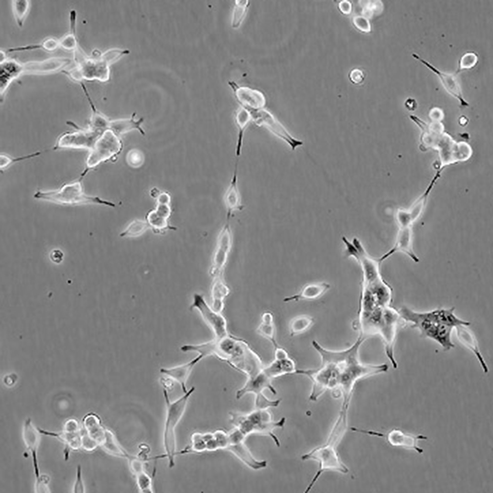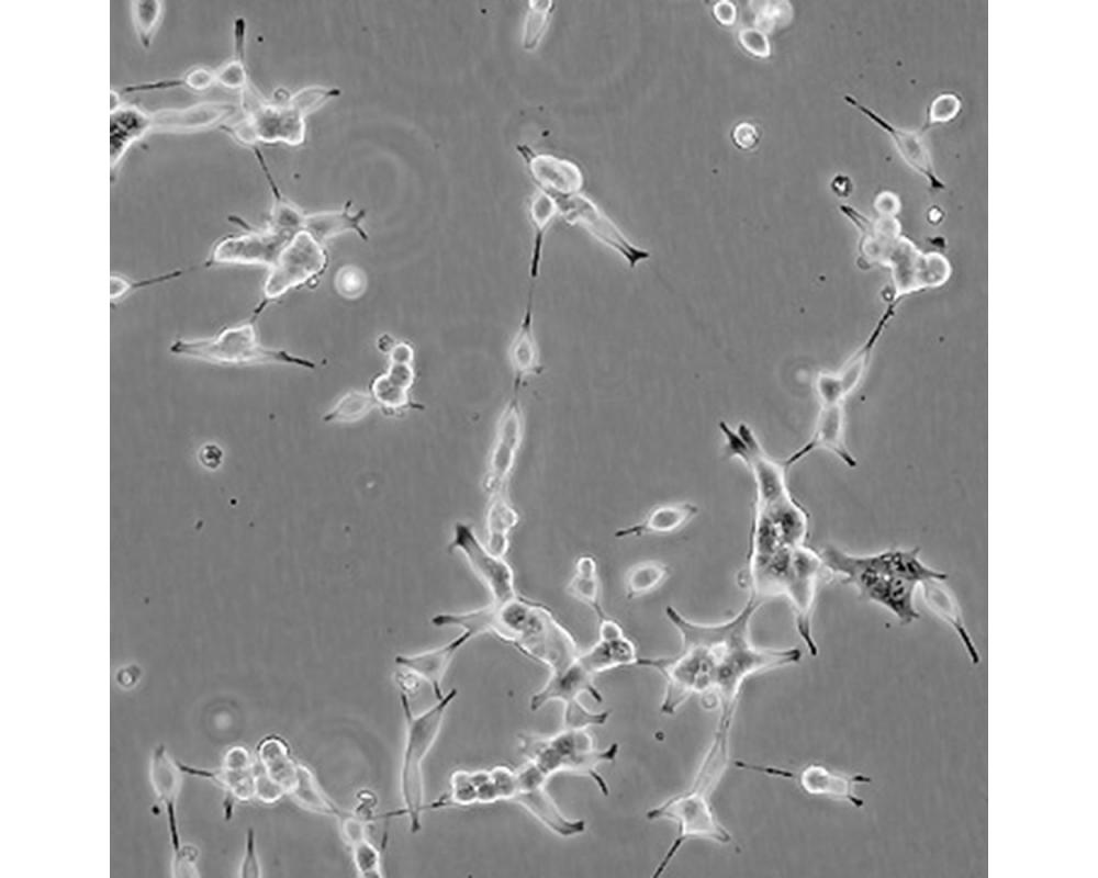 人前列腺癌細胞LNCaP克隆FGC是從一位50歲白人男性(血型B+)的左鎖骨淋巴結針刺活檢中分離,該患者經確診為前列腺癌轉移。 這株細胞對5-α-二氫睪酮(生長調節子和酸性磷酸脂酶產物)有響應。 這株細胞并不形成一致的單層,而是形成集落,在傳代時可以用滴管反復吹吸打碎。 它們僅僅輕輕地吸附在基底上,不形成匯合,很快使培養基變酸。 生長很慢。 傳代后48小時內不應擾動。 當培養瓶封包后,多數細胞從培養瓶底分離,懸浮在培養基中。 收到后,在通常培養單層細胞的條件下培養24到48小時,以合細胞再貼壁。